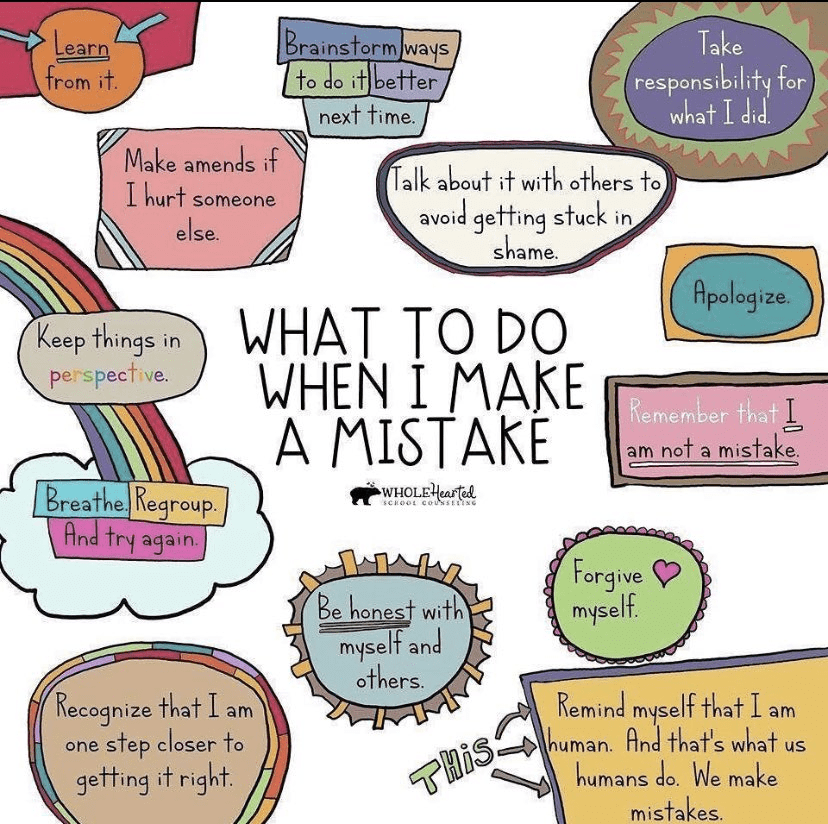 This means I will inevitably make mistakes, both in terms of individual acts but also in relationships as I get to know people in a new context. I have a tendency to enter a shame loop even with very minor errors, which leads to fear in terms of making errors and impacts on my stress levels. I want myself and the team to understand that we will support each other through those mistakes and make deliberate, thoughtful choices in relation to the below to support reflection, learning and moving forward.