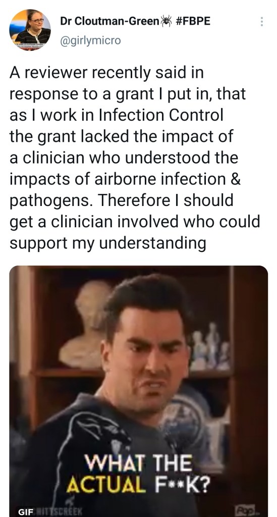 The grant was about the detection of bioaerosols in hospitals to support rapid IPC interventions and changes to patient management in regard to their infection/colonisation. The reviewer, a respiratory consultant, responded to the proposal to say that, as there was no medic on the proposal, the team could not possibly have an understanding of the risks associated with respiratory infection, and that one was needed for the grant to be funded. I must admit to being more than a little peeved by the response.