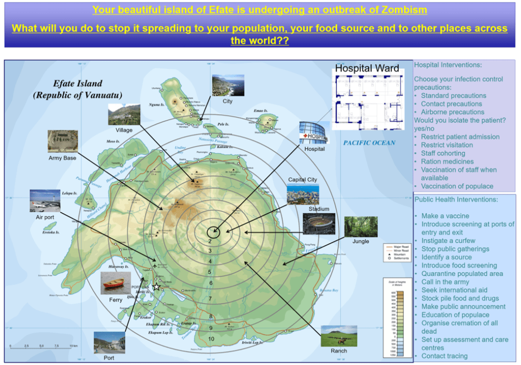 Once you have your zombies designed you can then play the scenario. Each different type of zombie requires different infection control and public health decisions/prioritisation. Make the wrong choices and the zombies will reach the port or airport and get off your island to infect the outside world. They can also infect your food supply, take down your military, or cause mass point-source outbreaks if you fail to shut down public events. All decisions aren’t equal, so make your choice…+