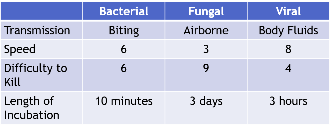 This decision will affect not only how your zombie transmits infection, but also how fast and easy/hard to kill it is.