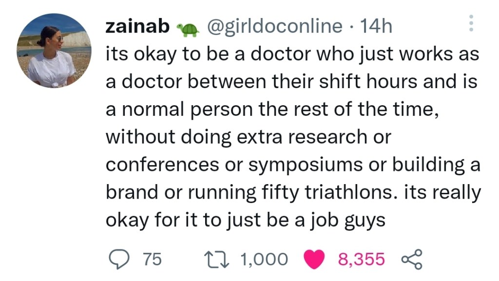 All of this drive has definitely had its benefits, as I said there are times when this self-competition is really helpful. I would not have managed to get a consultant post or tick all the boxes that needed ticking without it. The issue is that how do you stop when it is no longer useful or even harmful?