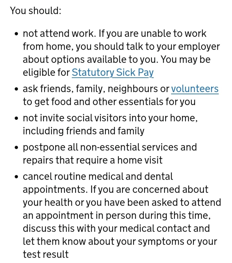 - Ensure you have all the medications you might need (both for COVID-19 and otherwise) for 2 weeks. Think symptom relief paracetamol/lemsip etc