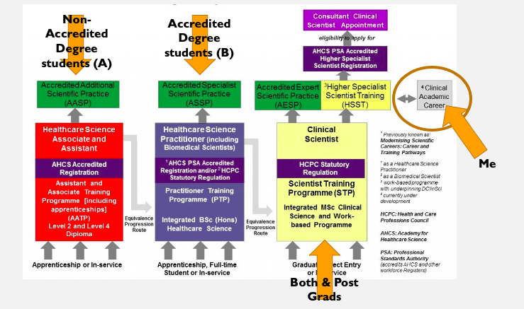 In a recent lecture on roles in the NHS, a student asked me where I currently sit. I pointed to the training pathway for healthcare scientists at point 4 – the Clinical Academic Career. ‘Ah I see’ they replied, “you’re in Clinical Academic Purgatory whilst you have your kids, you’ll go back to your real job eventually”. Well that stung a bit! But it’s a valid point, I think that the move to a teaching role in a university is often seen as a bit of a soft option. Nicer hours that running your own lab with a better work life balance, just don’t mention the marking! It’s not completely wrong either, the chance to spend my evenings and weekends with my partner and children even when drowning in marking is a huge perk.