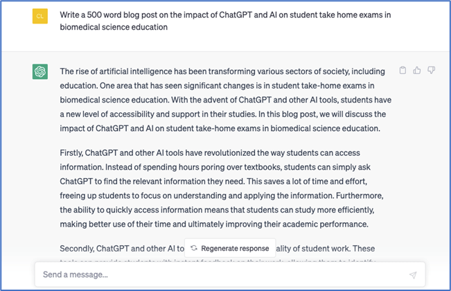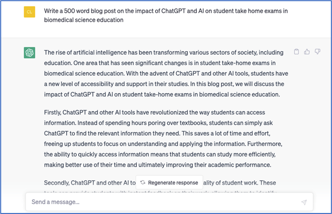 Input Question: Write a 500 word blog post on the impact of ChatGPT and AI on student take home exams in biomedical science education