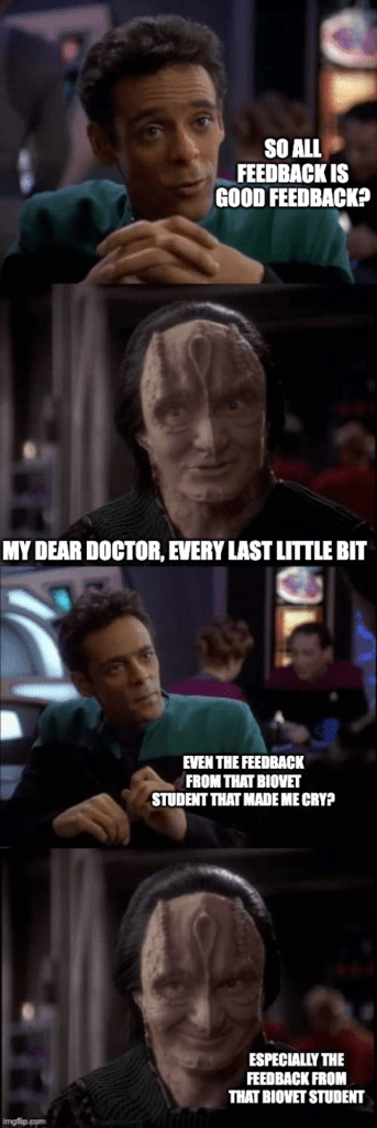 So, the other night before a conference @girlymicro and I were sat in a hotel bar, drinking martinis and listening to me bemoan some fairly harsh feedback I recently received anonymously from a student in the form of the oft dreaded ‘Module evaluation feedback form’. The conversation went a little like the Deep Space 9 meme of Julian and Garek that’s doing the rounds – you know the one….