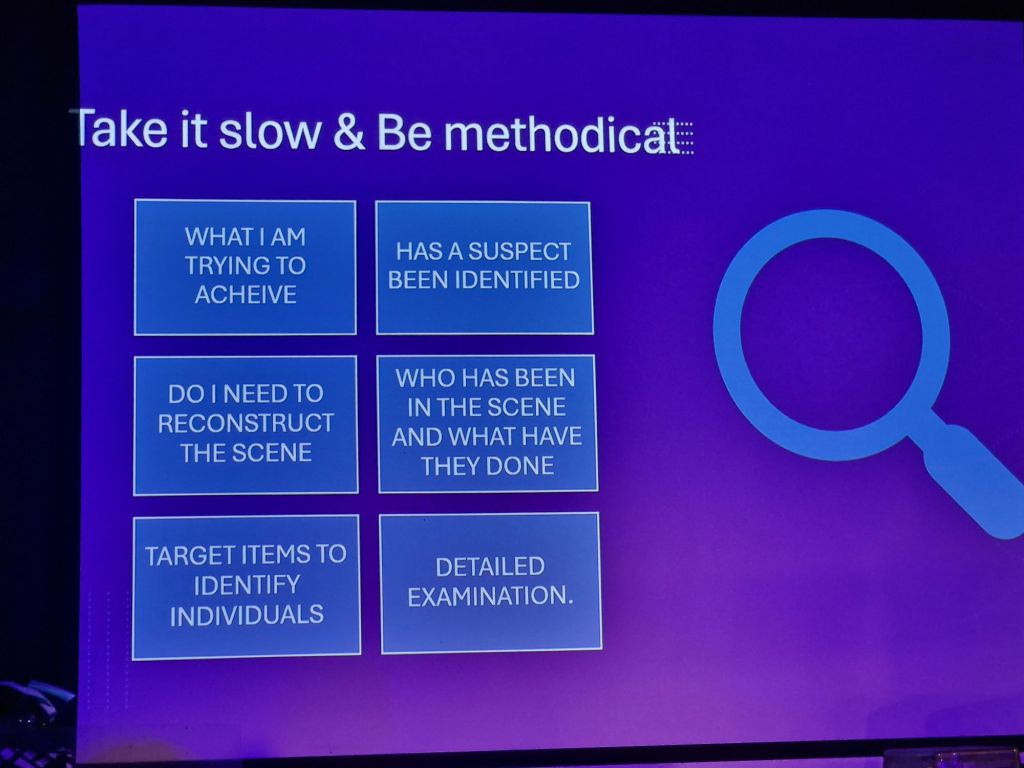 The first third was based around learning who Simon was, what drove him and how he got into his work as a scientist. Fundamentally this section is about building of rapport as well credential building. It also enables the audience to settle in and for an expectation setting phase to be undertaken. The second third was a practical session. This is where Simon demonstrated some practical aspects of what a bludgeoning event could cause in terms of blood splatter, and scene investigation. This enabled a change in pace and energy, which breaks things up for people as they will have been sitting for some time at this point and changes it from being a didactic slide presentation. It also means people go into the break with a level of introduction of what may be discussed in more detail post break and therefore your audience can choose how much information they are comfortable with, and gives an exit opportunity if needed. This gives detail without inclusion of people or actual harm, and therefore allows engagement without emotional risk. The final section, post interval, was based on actual cases, still rooted in technical discussion, which supports focus on facts rather than emotion. This type of structure supports engagement and gradual submersion rather than attempting to shock.