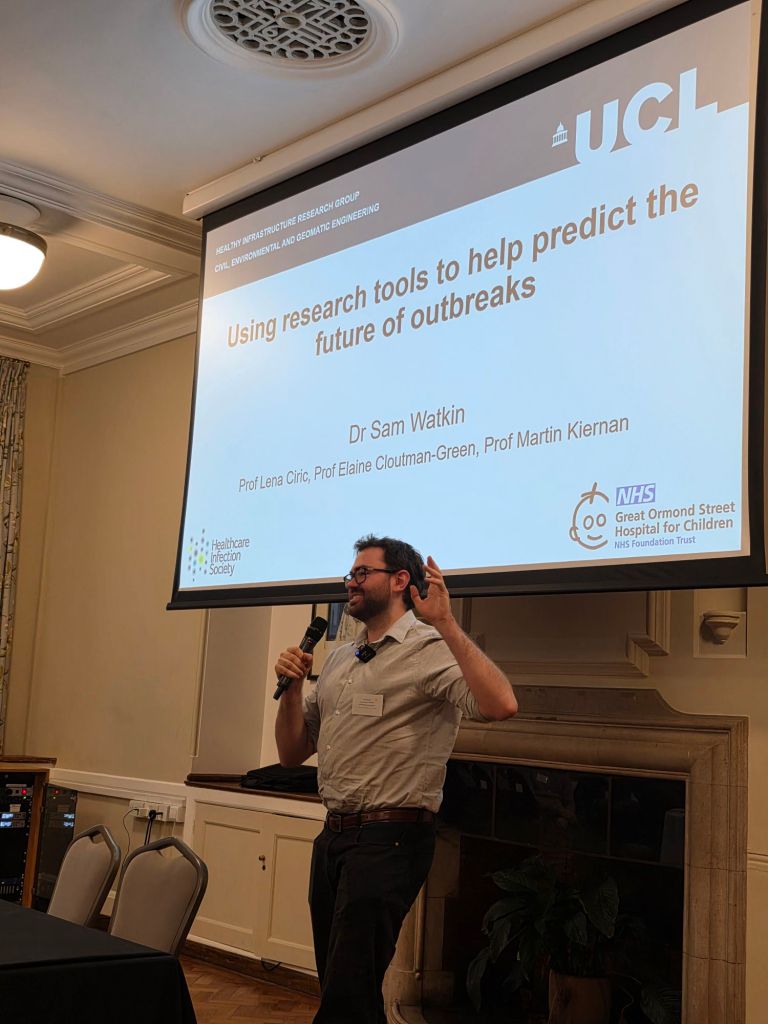 To close the morning session we have Dr Sam Watkin discussing research tools to help predict the future of outbreaks. Sam began acknowledging the current challenges facing preventing transmission of environmental organisms. In his PhD he aimed to identify how microbes disseminate through the clinical space, if the starting contamination site determined how is was disseminated and if the usage of space influenced microbial transmission risk. IPC is often retrospective to the aim was to develop research tools to allow the development of prospective knowledge. Sam used cauliflower mosaic virus DNA markers as a surrogate for pathogens, and followed its movement around two different units. It was shocking to see how far this benign organism could spread in such a short time.