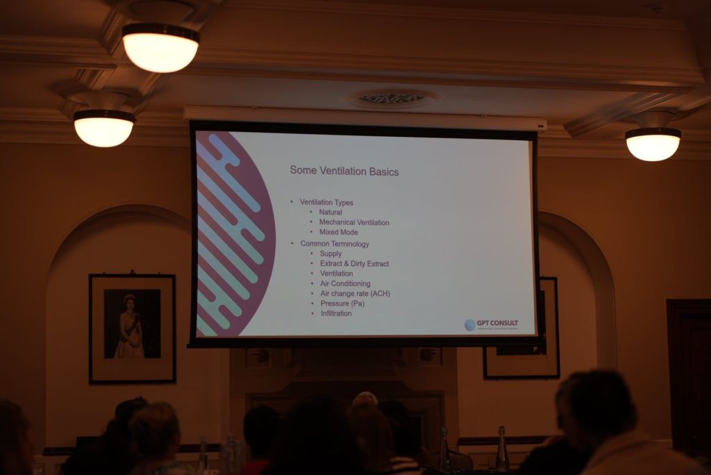 To close the first session, we have Louise Clarke who knows everything there is to know about proper ventilation. Ventilation is essential the movement of air within a system. The law tells us we must provide ventilation under the Healthy and Safety at Work Act, and building regulations set a minimum standard for ventilation. The main reason for good ventilation is to have a safe and comfortable environment; to remove odours, to control temperature and importantly to protect from harmful organisms and toxic substances. We have natural ventilation (like opening a window!), mechanical ventilation which pushes air around the building and a mixed mode – a combination of the two. The preferred method for ventilating a hospital remains natural ventilation, something which really shocked the group. It might work well on a windy day but it certainly doesn’t cover all areas and some times of year, like winter, it’s really no good at all.