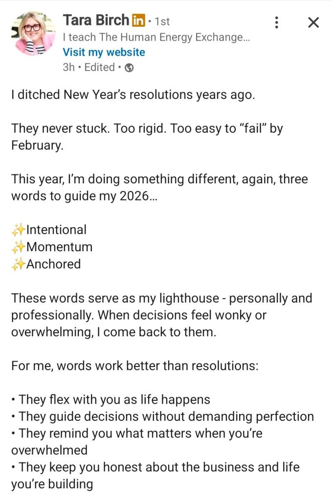 The inspiring Tara Birch made this post on LinkedIn before Christmas and it really resonated with me. I knew that I didn’t want to make a standard January post, but instead make some promises to myself, using words which will help keep me on track linked to my aims, values, and passions.